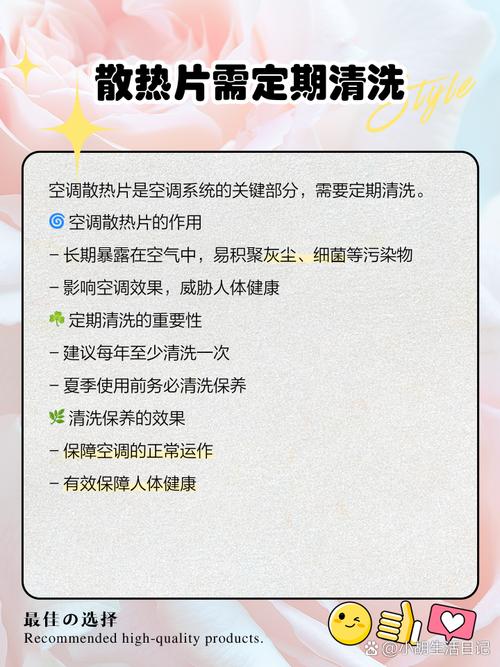 〖Four〗、清洗空调散热片的步骤如下:断电处理:首先,断掉空调的电源开关,比较好是直接拔掉电源插头,以确保安全。拆下过滤网:接着,将空调的过滤网拆下。这一步是为了更好地暴露散热片,便于清洗。喷洒专用清洗剂:然后,使用专用清洗剂对准散热片均匀喷洒。