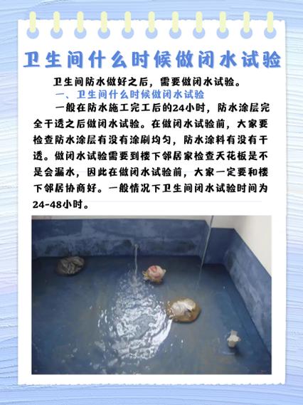 〖Three〗、卫生间闭水试验是确保防水效果的重要步骤,通常在防水层施工完毕并完全干燥后进行,时间大约在24小时之后。在进行闭水试验前,应确保防水涂料均匀涂抹且完全干燥,同时要与楼下邻居沟通,确保试验期间他们能够配合检查天花板是否有漏水情况。闭水试验的持续时间通常为24至48小时。