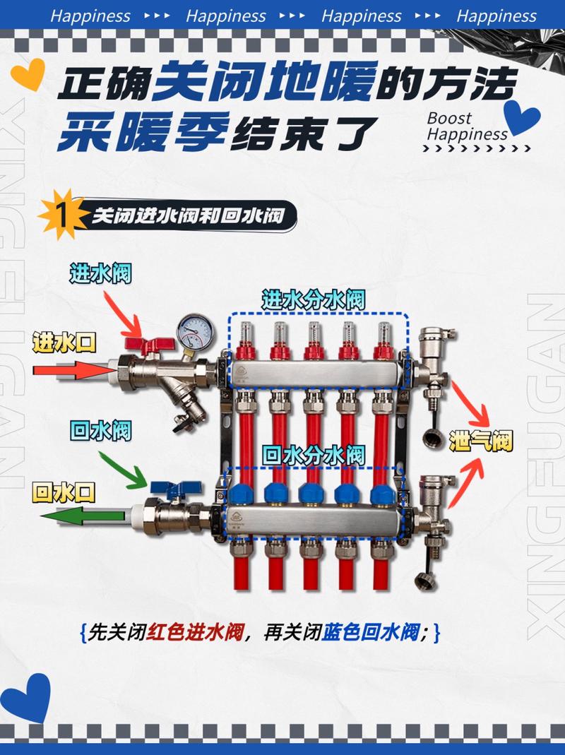 on表示开启,off表示关闭。参照说明书:如果有使用说明书,按照说明书进行操作为准。一般初次调试使用之后,不需要轻易去变动设置。地暖分水阀的开关方向:逆时针方向:通常是开启状态。顺时针方向:通常是关闭状态。具体可以看阀门上的标识,按照标识操作即可。