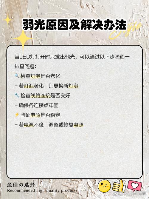 〖Three〗、LED灯打开只发弱光不亮的原因可能有以下几种: 电压不稳定: 在用电高峰期,电压的不稳定可能导致LED灯只发出微弱的光。此时,可以尝试在非高峰期观察LED灯的工作状态,或者请专业人员检测家中电压是否稳定。 线路损坏: LED灯的线路如果发生损坏,也可能导致灯光微弱。