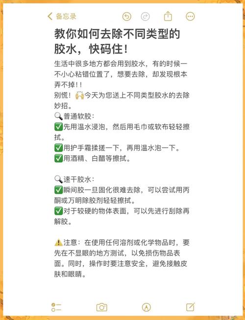 〖Five〗、使用酒精去除胶水:将酒精蘸取在纸巾上,轻轻擦拭受粘胶影响的区域。对于顽固的胶渍,可以先用热毛巾加热使其软化,然后再用酒精擦拭干净。 利用丙酮清除胶痕:丙酮的清洁效果比酒精更佳,它能迅速溶解胶渍。使用时,同样先用纸巾沾取丙酮,然后擦拭需要清理的区域。