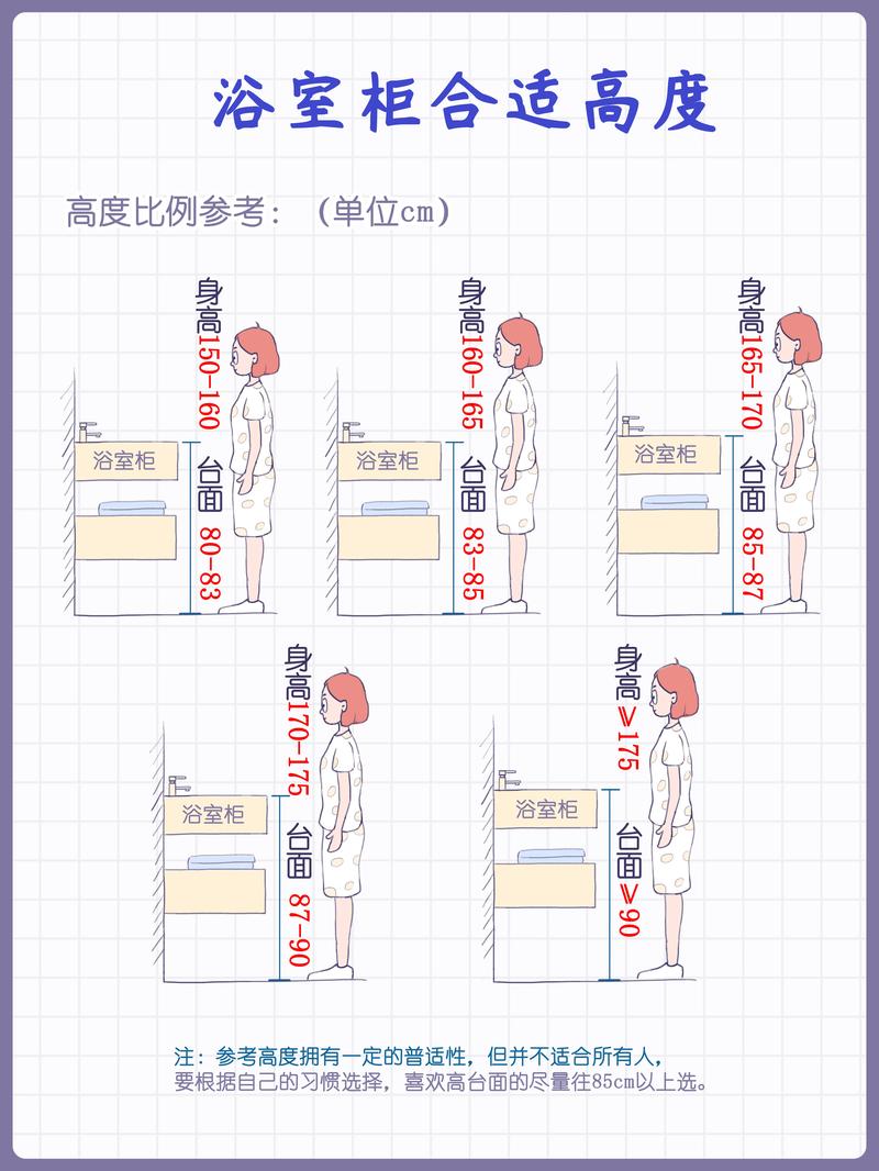 〖Three〗、综上所述,台上盆浴室柜台面高度的合适选取应结合用户身高和使用习惯进行确定,一般设定在75到85厘米之间最为适宜。同时还需要考虑家庭成员的身高差异以及浴室空间的整体布局和设计因素,以确保最终选取的台面高度既舒适又实用。