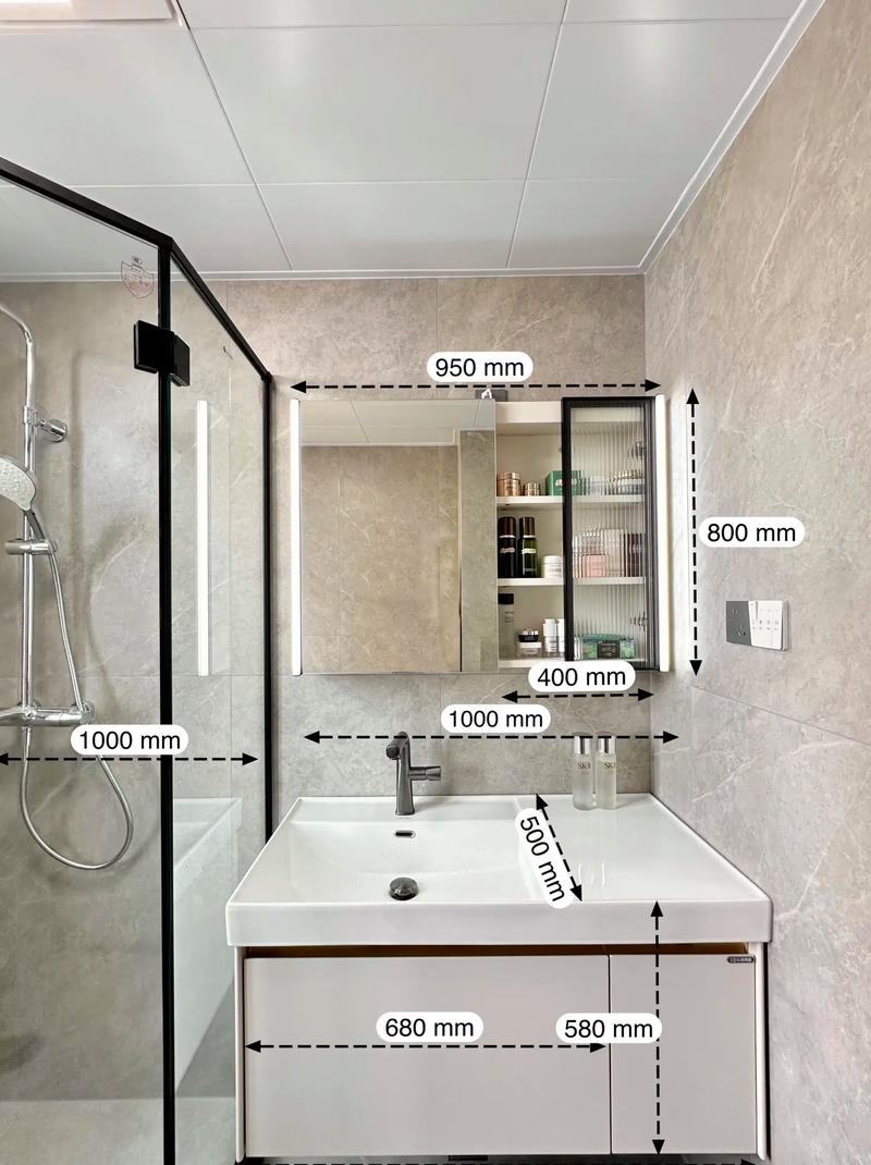 如果浴室柜超小,只能放台盆了,还有一种是挂墙式瓷盆,不仅美观,而且不占地方,长500mm左右。浴室柜除了常用的标准尺寸外,长的还有1200mm的,一般欧式的和简欧的浴室柜尺寸要大些,因为大部分要加上边柜,可以达到1600mm。