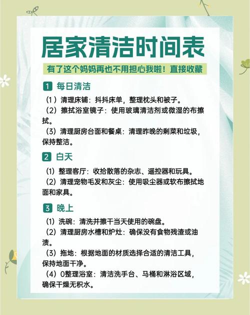 〖One〗、对于家庭清洁的频率,一个星期进行一次大扫除,我认为是相当合适的。这样的频率既能够确保家中的卫生状况始终保持在一个较高的水平,又不至于因为过于频繁的打扫而消耗过多的时间和精力。在进行大扫除时,可以将整个过程分为几个部分,比如厨房、浴室、客厅、卧室等区域。