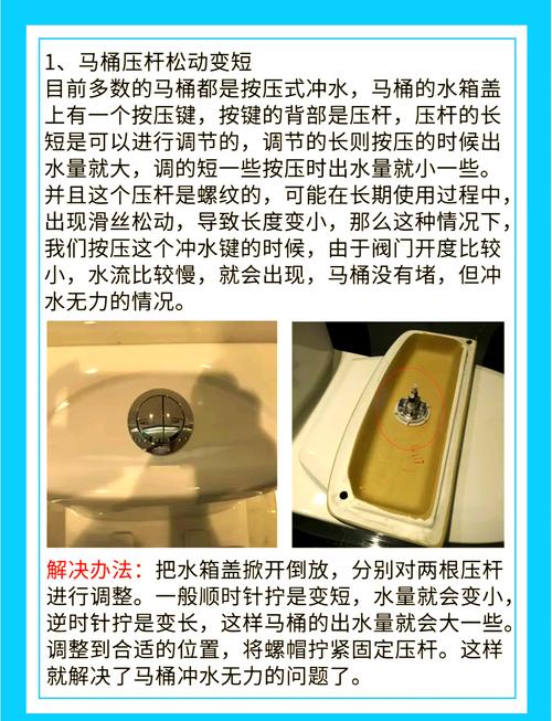 〖Two〗、马桶冲水无力,可以尝试以下几种解决方法:调节水箱水位:马桶冲水无力可能是因为水箱中的水没有达到冲水所需的要求。此时,即使是虹吸式马桶也无法发挥其虹吸效果。可以尝试调节水箱中的零部件,将水位调高。或者,直接在水箱中放置两瓶矿泉水,以有效提升水箱的水位。这样,在冲水时,冲劲会相对较大。