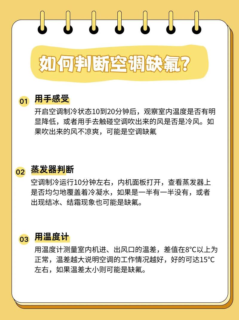〖Two〗、要判断空调是否缺氟,可以通过以下几种方法: 温度感知法: 开启空调大约10分钟后,将手放在空调的出风口,感受是否有冷气吹出。 同时,触摸室外机的外壳,比较室内机和室外机之间的温度差。正常情况下,温差应达到8度左右。如果温差不足,可能是因为缺氟。