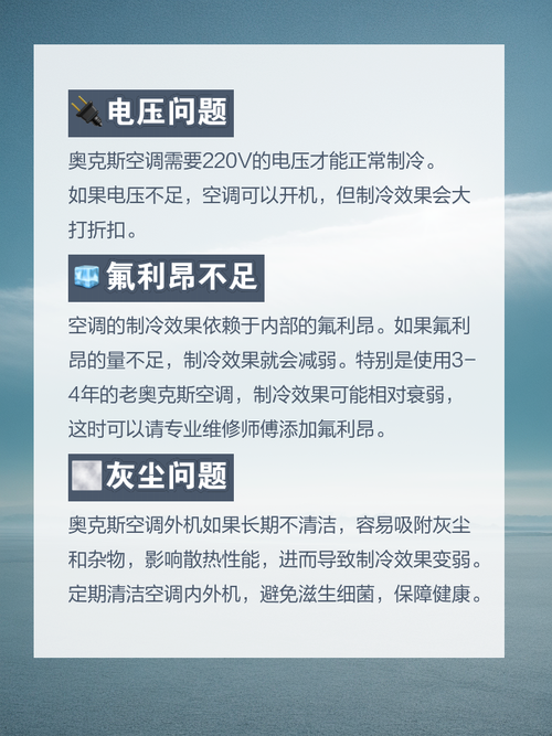 〖Two〗、奥克斯空调不制冷的原因主要有以下几点:电压不足:电压不稳定或不足会导致空调制冷功率下降,从而影响其制冷效果。当电压低于空调正常运行所需的电压时,空调可能无法正常工作或制冷效果不佳。为了解决这个问题,可以检查家庭电路的电压是否稳定,并确保空调连接的电源线路符合其运行要求。
