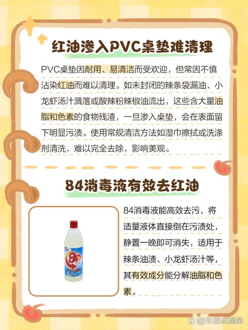 〖One〗、要去掉PVC桌垫上的红油,可以尝试以下方法:使用有机溶剂:溶剂汽油:用干净的布蘸取适量的溶剂汽油,轻轻擦拭红油污渍,直至污渍被去除。注意使用时要保持通风,避免吸入有害气体。三氯乙烯、四氯乙烯:这些溶剂同样可以有效去除红油污渍。使用时需佩戴防护手套和口罩,确保安全。