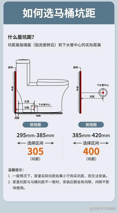〖One〗、在选取马桶坑距时,应考虑卫生间排水口至墙面的距离。近来,常见的坑距尺寸包括30厘米、35厘米和40厘米几种。 若卫生间墙面至排污口中心的距离为350厘米,则应选取350厘米坑距的马桶。请注意,贴砖后若坑距测量不准确,可能会导致马桶安装不合适。