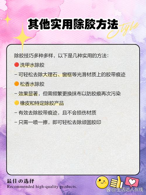 使用稀钠水或油漆稀料:稀钠水或油漆稀料可以轻松擦去老化胶带。但使用时要注意安全,避免接触到皮肤和眼睛。电吹风吹干后刮除:用电吹风吹干老化胶带,使其变得干燥易碎,然后轻轻一刮即可去除。洗甲水擦拭:用棉签蘸取洗甲水,在老化胶带上擦拭,也可以去除。但同样要注意避免接触到皮肤和眼睛。