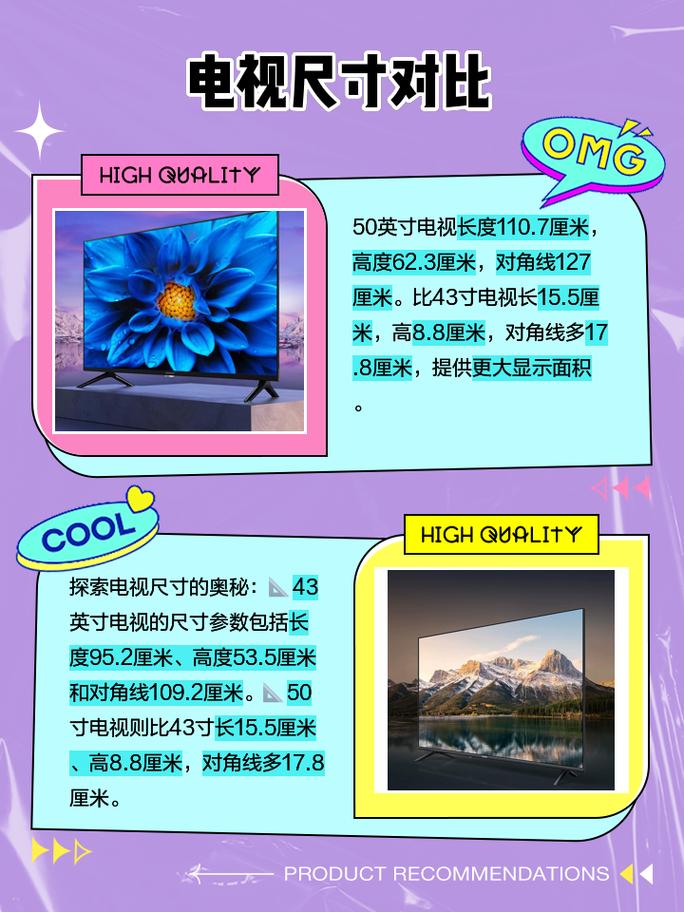 〖Three〗、尺寸对比:在电视领域,“寸”指的是电视屏幕的对角线长度。因此,50寸和43寸电视的尺寸差异主要体现在屏幕对角线长度的不同。 具体尺寸换算:按照标准的电视尺寸换算,50寸电视的屏幕对角线长度为约127厘米,而43寸电视的屏幕对角线长度为约109厘米。这意味着两者在长度上相差近20厘米。