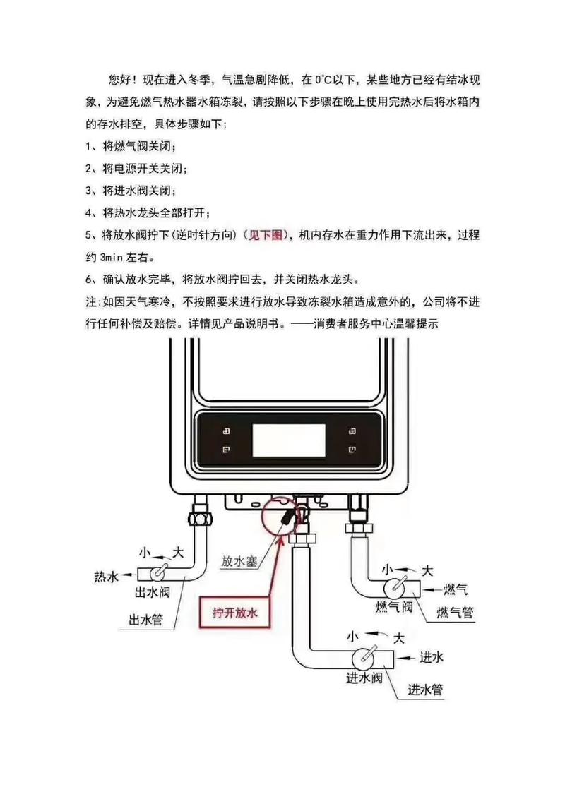 〖Three〗、打开燃气阀门:在使用热水器之前,请确保燃气阀门已经打开,并检查燃气管道是否正常连接。打开水阀:将热水器的冷水阀门打开,调节水流量,确保水流顺畅。打开电源开关:将热水器的电源开关打开,此时热水器将开始工作。调节温度:根据您的需要,通过热水器上的温度调节旋钮,调节热水的温度。