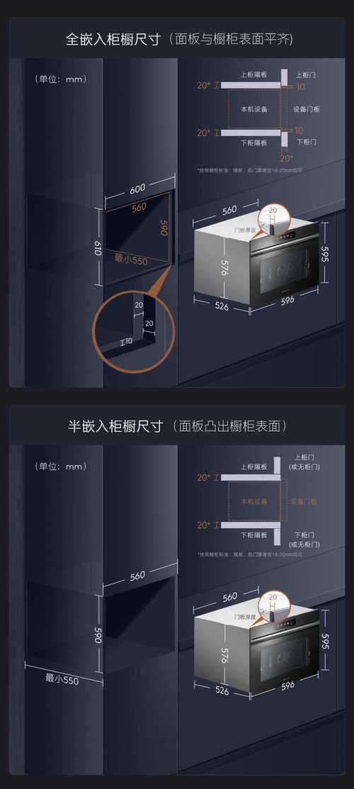 〖Two〗、嵌入式烤箱的常规尺寸为595*590*560mm,宽度大于560mm,高度大于580mm。这样的尺寸不仅美观,还能提供足够的空间进行烹饪。如果橱柜后面有后背板,建议不要将烤箱的插座留在烤箱柜子的后面,而应将其安装在旁边的柜子里,这样不仅方便使用,还能保证安全。