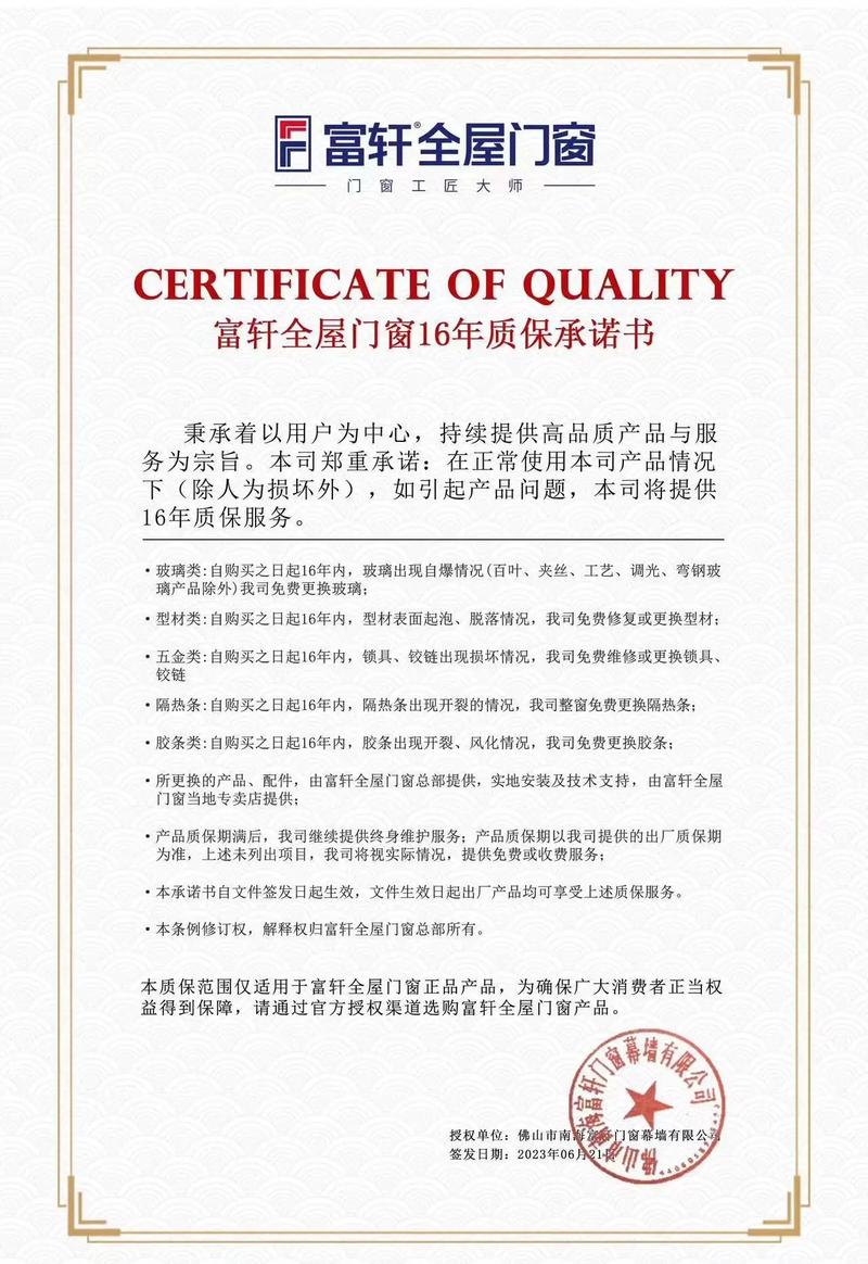 〖Two〗、具体的保修期限会根据不同的产品品牌、材质以及当地法规而有所差异。一般来说,常见的门窗保修期为2至5年不等。在这一期限内,如门窗出现非人为损坏,如玻璃碎裂、五金件损坏、结构松动等,厂家或安装单位将负责免费维修或更换。注意事项 值得注意的是,保修期并非终身制。