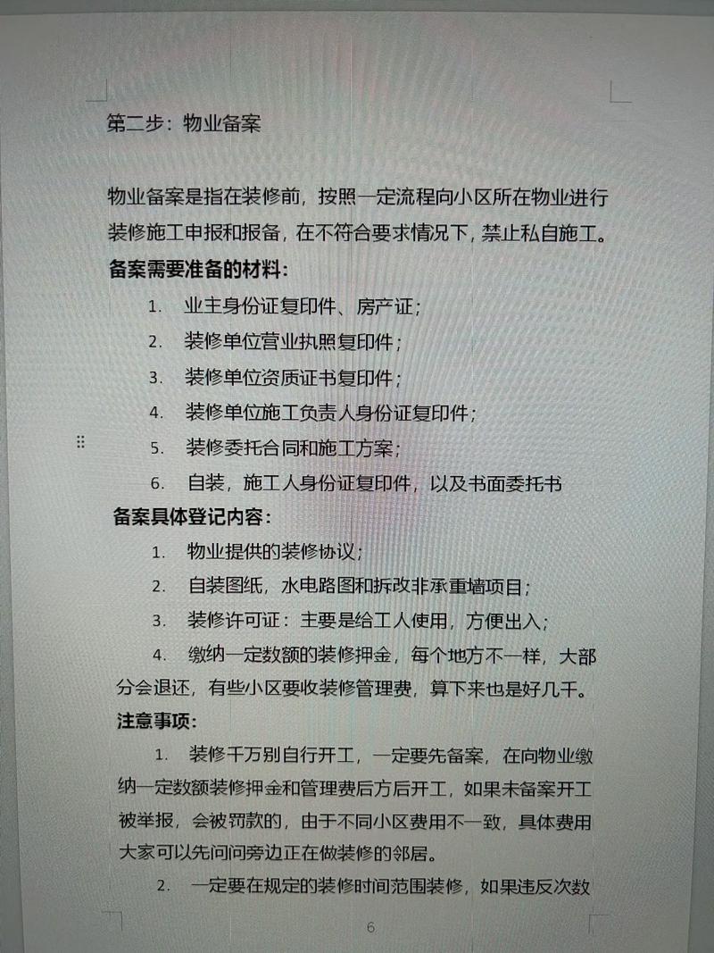 〖Two〗、这是合法进行装修的必要手续。注意:装修去物业办手续时,通常需要业主本人亲自去办理,以确保身份的真实性和装修意愿的真实性。在装修前,业主还需要做好前期的规划和设计,包括量房出设计图等,以确保装修过程有条不紊,不遗漏任何项目,并准确把握装修所需的材料和费用。
