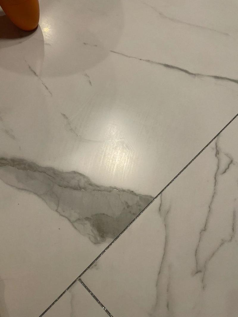 〖Two〗、釉面缺陷 如果地砖拖干净、水渍干透后,瓷砖表面依然雾蒙蒙的,很可能是釉面缺陷所致。也就是胚体的釉料发生了一些化学变化,从而产生了“白雾”,这种情况在仿古砖上比较常见。 解决方式:这属于瓷砖质量问题,只能拆了换砖重装。