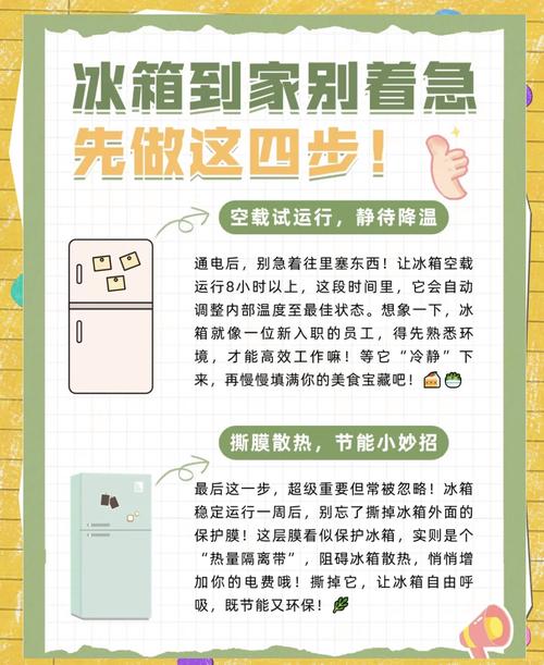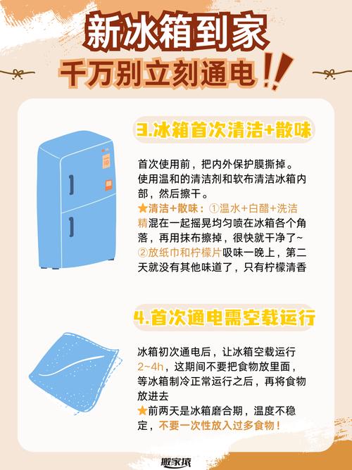 〖Three〗、如果新冰箱试了电后又拔掉,不会造成负面影响。可以在半小时后再次插电,这样不会对冰箱造成损害。新冰箱的处理步骤包括:打开所有冰箱门以祛味,用湿毛巾清洁冰箱表面,确保冰箱背面和侧面有足够的空间散热,将冰箱放置在阴凉通风的位置,并确保排水嘴的过滤堵头放置正确。