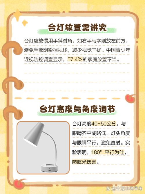 〖Three〗、台灯在以下角度和位置摆放时最保护眼睛:台灯高度:当使用台灯进行电脑办公或看书时,台灯的高度与眼睛和电脑或书本的距离应保持在6080厘米之间。台灯的高度应与书本的高度相距4050厘米,以避免手部遮挡造成阴影。