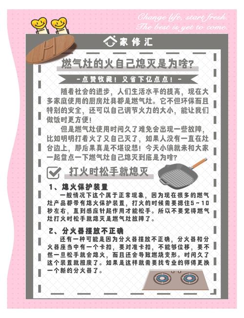 〖Three〗、燃气不足:家中燃气不足是导致燃气灶打火后自动熄灭的常见原因之一。此时,需要及时充值燃气以确保燃气灶可以正常工作。电池电量低:燃气灶的电池电量不足也会影响其正常工作,导致火焰熄灭。可以尝试更换新的电池来解决问题。软管问题:连接的软管如果被压弯或折扁,可能会影响燃气的流通,从而导致火焰熄灭。