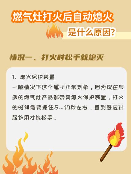 〖Four〗、燃气灶点火后燃烧一会后自动熄火的原因主要有以下几点:点火器故障:检查点火器是否损坏,若损坏则会导致无法正常持续点火。电磁阀问题:电磁阀可能损坏或老化,导致无法稳定供气,从而引起熄火。风门调节不当或被堵塞:风门调节不当会影响燃气的燃烧,被堵塞则会导致燃气供应不畅,进而引发熄火。