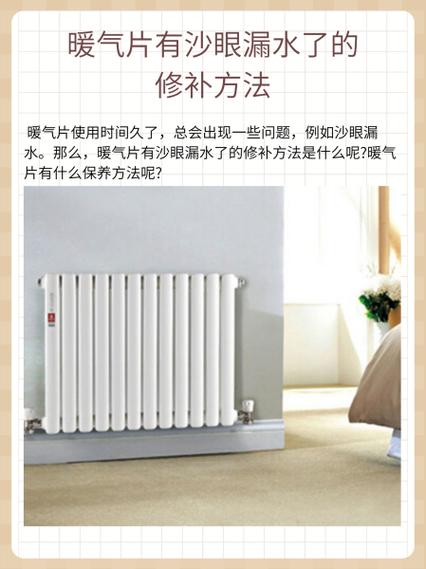 〖Three〗、暖气有沙眼漏水,可以采取修补沙眼、更换暖气片、排水处理等方法解决。如果只是沙眼漏水,可以尝试修补。首先,关闭进水阀和回水阀,找到漏水的位置并清理干净,然后使用专用工具或材料将破损处密封起来。比如,可以用橡皮筋或自行车内胎暂时堵住漏水处。