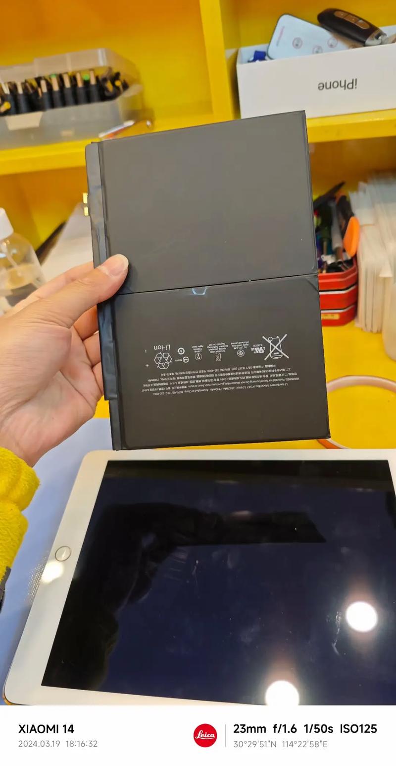 下面就简单了,撬开电池(反面加热,边加热边翘),换上新电池,贴上双面胶。测试一切正常。完美更换。这air2再继续战斗两三年应该没问题。大家的Pad如果电池也不行了,可以操练起来了。