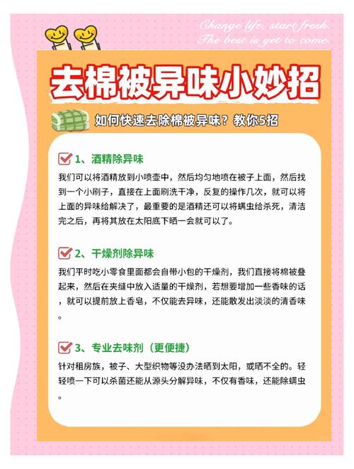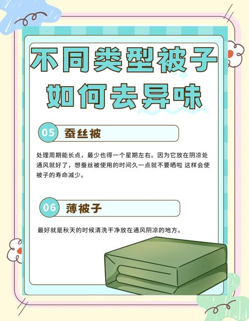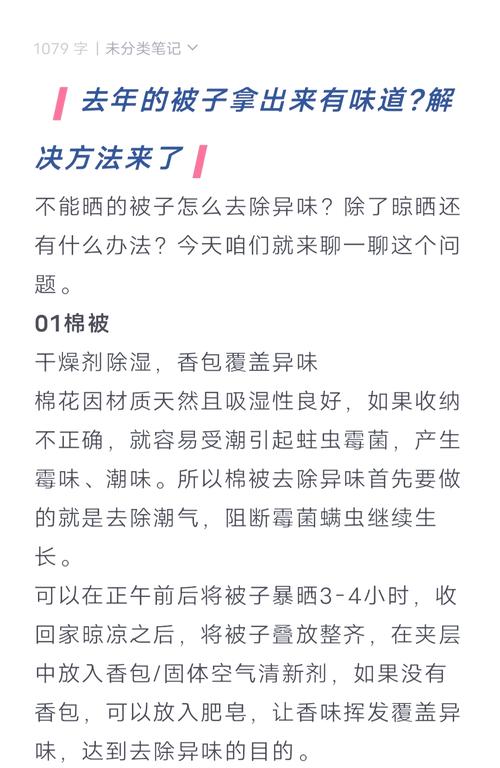 利用阳光晒:在傍晚时将棉被叠好,放入几小袋硅胶干燥剂和几块香皂,然后放置在太阳下晒。干燥剂和香皂应分层放置,避免堆叠。经过这样的处理,几天内被子就会去除异味。香皂用过后仍可继续使用,不会造成浪费。 使用茶叶:准备一张纸巾,上面放一些茶叶,折叠并用橡皮筋固定。