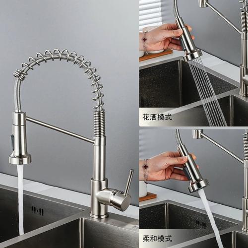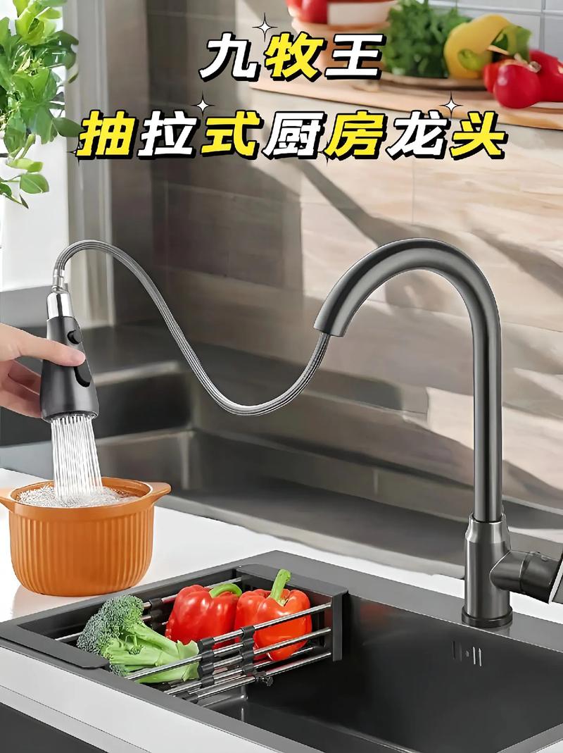 优点: 使用便捷:抽拉式水龙头的软管可以随意伸缩,方便清洗厨房各个角落,特别是清洗较大的锅具或者水槽边缘时,无需移动锅具或水槽内的物品,大大提高了清洗效率。 多功能性:抽拉式水龙头可以满足多种用水需求,如冲洗蔬菜、水果,甚至可以用来给宠物洗澡等,增加了厨房的实用性。