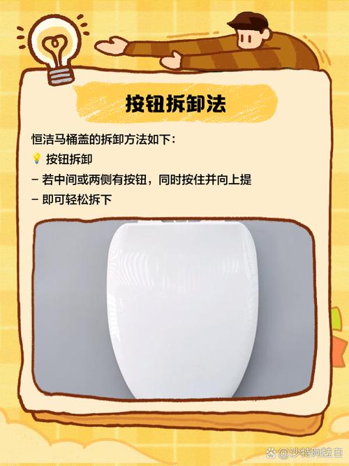 〖One〗、第一步:用工具解开旋钮 恒洁卫浴马桶盖通常有两个旋钮,一个在马桶的一侧,另一个在马桶盖的顶部。用扳手或者钳子将它们均匀松开即可。第二步:取下安装体 拧下标注为“安装体”的零件,找到螺母和螺栓,将它们都松开。慢慢地将安装体从马桶上取下。