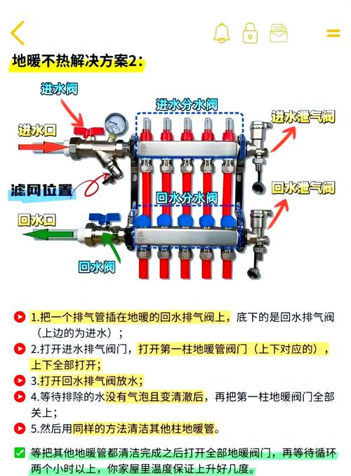 〖One〗、地暖暖气不热放水操作步骤如下:准备工具:购买合适的水管。准备钳子或扳手。准备毛巾用于包裹阀门,防止水溢出。确定放水位置:分水器上边进水管有一个放气口。分水器下边回水管有一个放气口。可以通过触摸确定:热的是进水管,凉的是回水管。先放进水管的气:将水管接到分水器进水管的放气阀上。