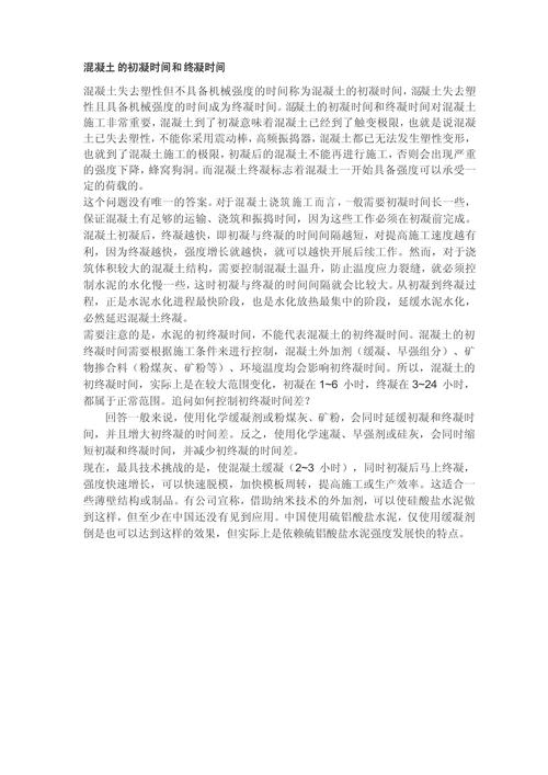 〖One〗、虽然没有混凝土终凝的国家标准,但根据国标规定,硅酸盐水泥的初凝时间不应早于45分钟,终凝时间不应迟于6小时30分钟。一般情况下,混凝土的终凝时间会比水泥的终凝时间更长,这主要取决于混凝土配方中缓凝成分的使用量。