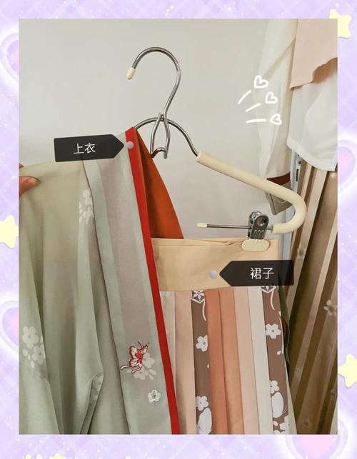 〖One〗、- **适合叠放的汉服:** 如上襦和裤子,应该平整地叠放。确保衣领、系带、袖子和紧身胸衣等部分对齐,这样可以避免穿着时出现困扰。- **适合挂放的汉服:** 裙子如果容易起皱,比较好挂起来。使用带夹子的衣架将裙子折平并挂直。如果裙子不易起皱,可以先按照合适的宽度折叠,然后从裙子的中心卷起。