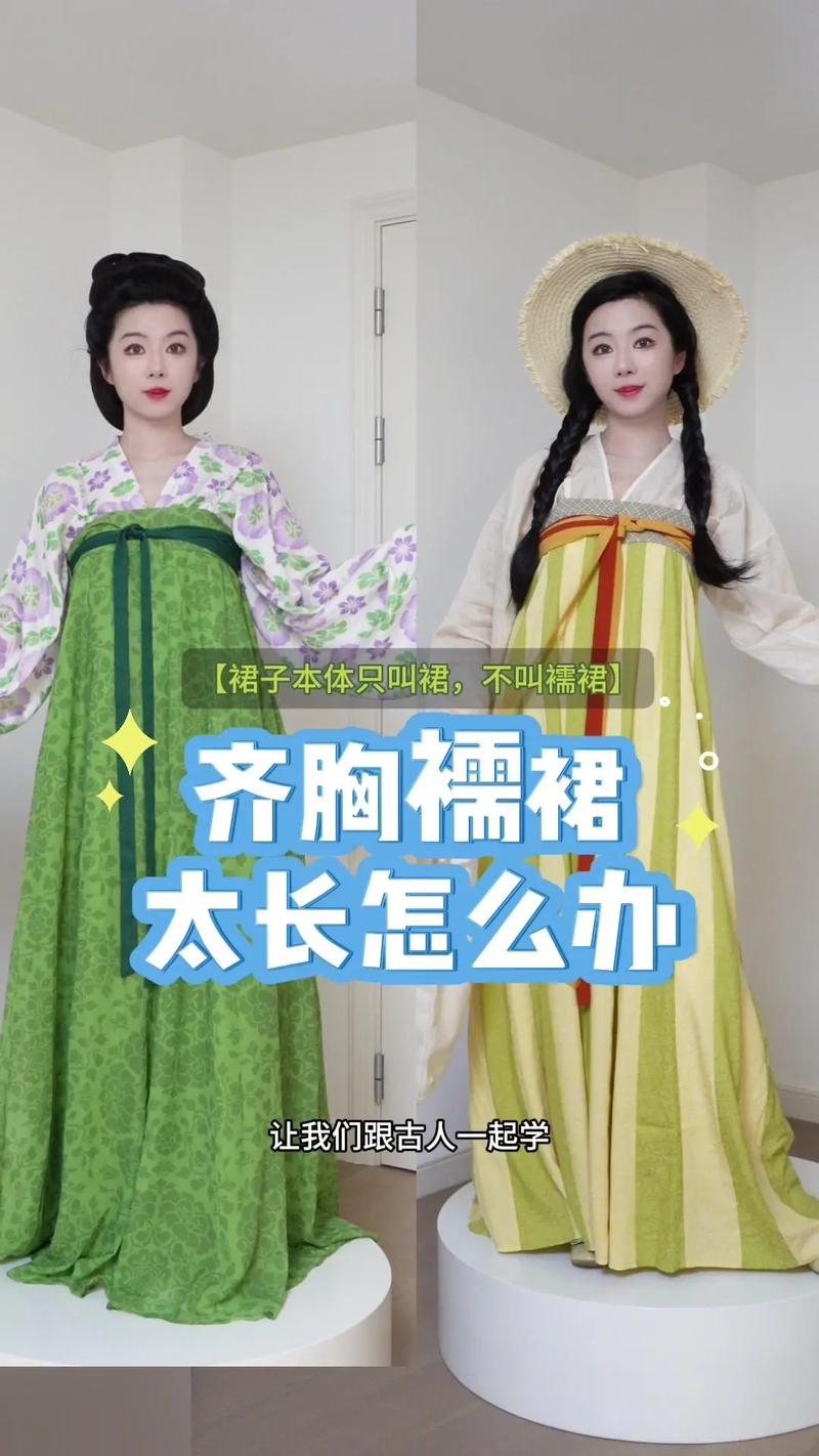 〖Three〗、汉服过长时,可以将裙摆改短至脚面以上,避免拖地。若在楼梯上,提一下裙摆,保持优雅姿态,坐下时同样注意。提高襦裙穿着位置也是一种方法,但需防止滑落。选取内增高的布鞋也是解决之道,但需小心行走以防扭伤。购买时确保尺寸合适,可避免此类问题。