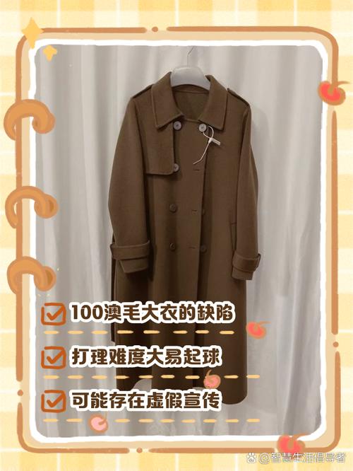 优点:澳大利亚羊毛以其高品质而著称,其含量越高,大衣的质量通常越好。澳毛大衣手感顺滑,保暖性能强,因此其费用也相对较高。澳毛属于羊毛中的优质品种,在保暖性和价值上均优于普通羊毛。缺点:纯羊毛面料可能会出现起球和起皱的问题,因此在穿着时需要特别注意保养。