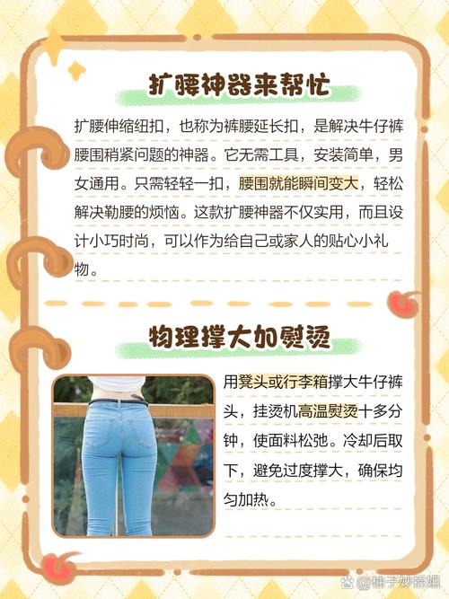 要把牛仔裤腰撑大,你可以试试这几个小妙招哦:用皮带过渡:最简单直接的方法啦,找条合适的皮带系上,既能固定裤子,又能当作装饰,时尚又实用!橡筋辅助:如果没有皮带,也可以试试用橡筋。