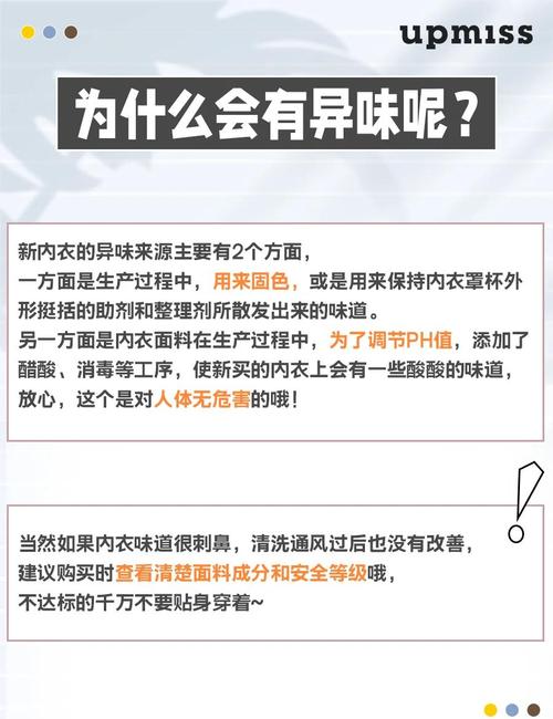 因为罩杯内的胶水味道,材料不好,高温后就会散发出味道。盐水浸泡:可以用盐水浸泡一下,然后晾干,盐水可以杀菌,让内衣更加的干净些。温水中兑入2勺左右的咸盐就可以了。柔顺剂:内衣的味道很重的可以试试柔顺剂。柔顺剂可以让衣服没有静电,而且还会有很自然的香味。