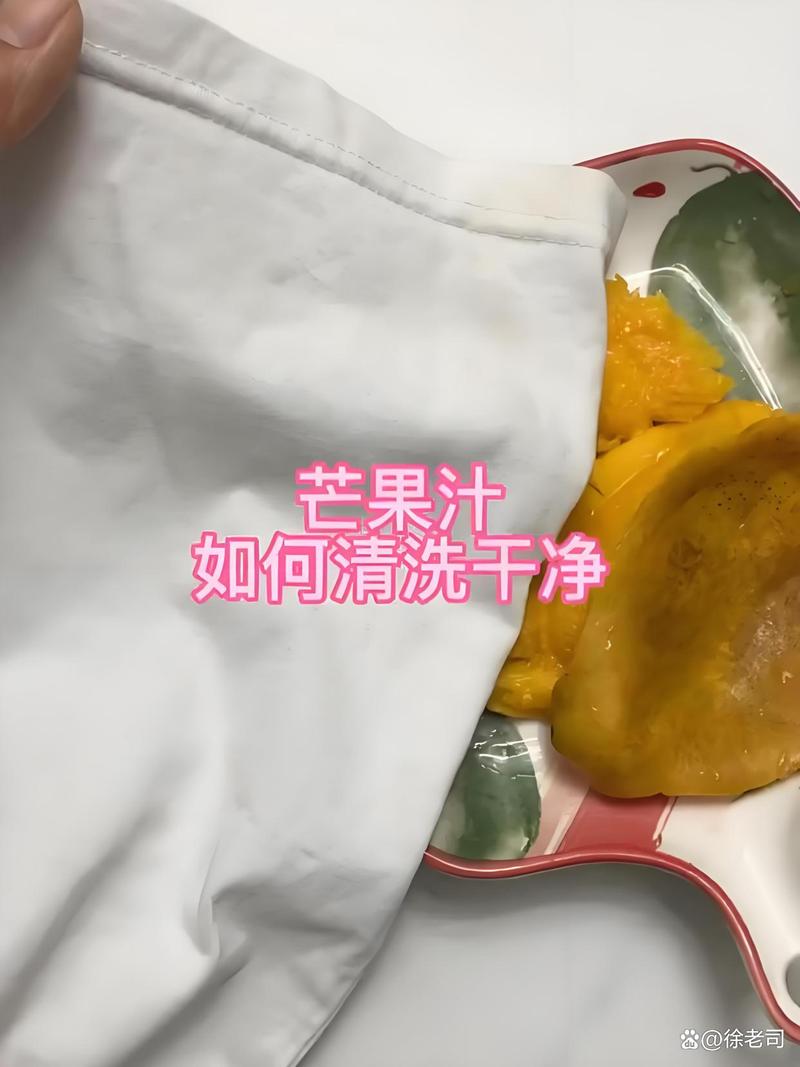 〖Five〗、方法一:食盐搓洗。在沾有芒果汁的地方撒上适量食盐,轻轻揉搓,让盐充分吸附果汁。之后用清水冲洗,能去除一部分果汁痕迹。这是因为盐有一定的吸附性,可初步带走果汁中的色素等成分。方法二:白醋浸泡。将衣服沾汁部位浸泡在白醋中,浸泡约15 - 20分钟。