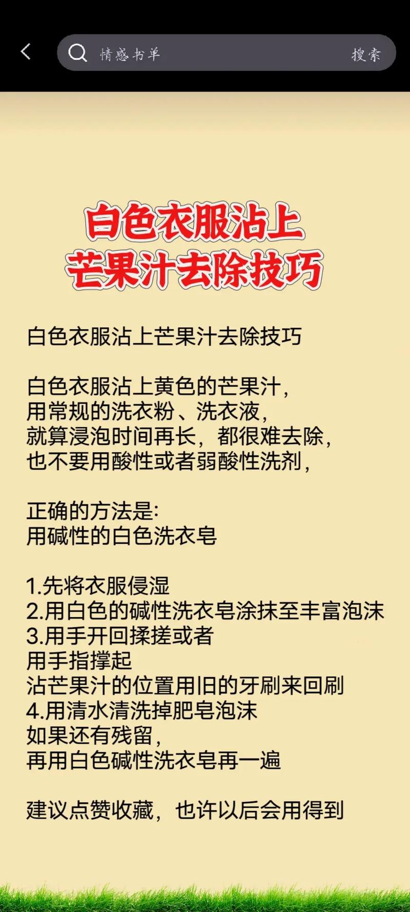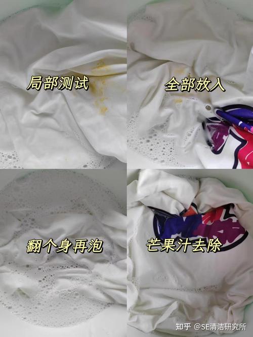 〖Five〗、衣服沾上芒果汁后,可尝试以下几种洗净方法。方法一:食盐搓洗 。在沾有芒果汁的地方撒上适量食盐,用手轻轻揉搓,让食盐充分与果汁接触,几分钟后,再用清水冲洗,可初步去除果汁污渍。方法二:白醋浸泡 。