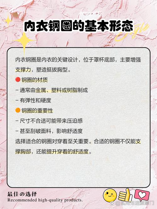 〖Five〗、如果内衣钢圈跑出来是因为内衣穿久了磨破封口或内衣质量不好,可以先尝试把钢圈塞回去,并用舒服耐磨的布补上。 洗内衣时,避免用力擦钢圈边缘,机洗时应使用洗衣袋,并扣好后挂。此外,关于内衣的选取,有钢圈和无钢圈的内衣各有优势,可以根据个人需求和舒适度进行选取。