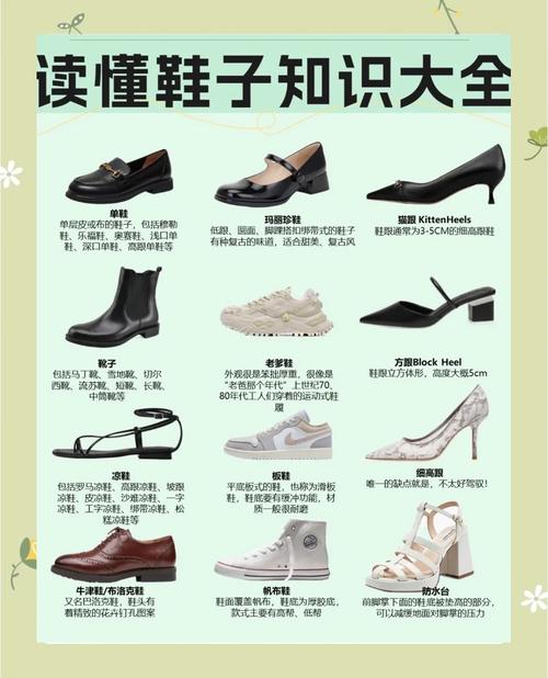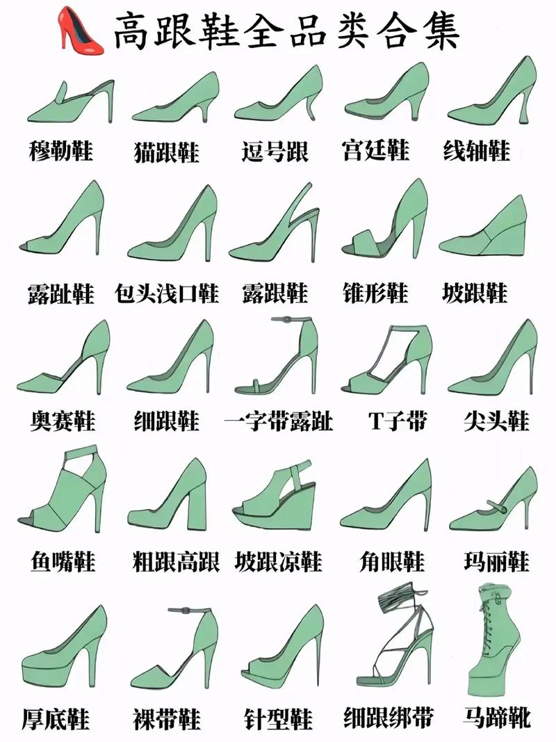 【20】鱼嘴鞋 露趾凉鞋,女性居多,展现性感风情。【21】罗马鞋 凉鞋款式,镂空交叉绑带设计,脚部裸露面积大,风格独特。【22】松糕鞋 厚底鞋,女鞋为主,增添时尚感。【23】坡跟鞋 设计独特,不累脚,提供舒适穿着体验。【24】高跟鞋 多种款式和高度选取,经典女性鞋款,强调女性魅力。