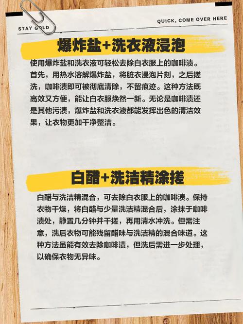 〖Three〗、咖啡渍弄到白衣服上,可以采取以下方法进行清洗:对于新鲜的咖啡渍:立即处理:脱下衣物,用热水反复搓洗,热水能迅速软化污渍并加速清洗。对于干固的咖啡渍:使用白醋和洗洁精:制作简易清洁剂,轻轻吸干小块污渍。使用苏打水:对于小面积污渍,可以用苏打水进行处理。