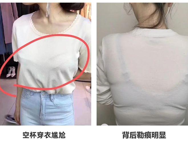 如果你发现穿文胸后胸上总有勒痕,即使文胸并不紧,可能是因为你的胸围尺寸太小。解决方法是购买一个增扣并自己加在文胸上,同时确保肩带调节得当。长时间勒得过紧可能导致头晕和肩部酸痛。 穿着无钢圈文胸可能会导致乳房下垂、副乳出现以及胸部外扩。