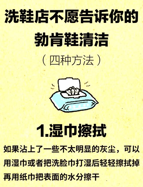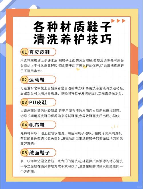 - 使用专门的清洁剂,并在不显眼的地方先做测试,以防止褪色或损坏。- 对于小面积的污渍,可以用干布轻轻擦拭;较大的污渍可以用蘸有中性洗涤液的棉布或毛巾轻轻擦洗。- 鞋子可以手洗,使用温和的洗衣液,这样可以保护皮质的同时清洁鞋面。避免水温过高,不超过40度为宜。