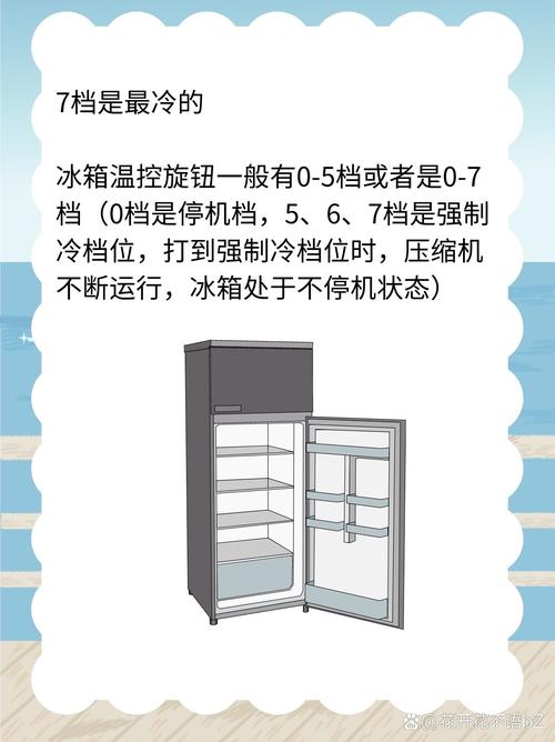 冰箱1至7档温度调节方法:冰箱上面标有0到7的数字,0是不工作的状态,数字越大制冷越强,7是比较高强度制冷,只要旋转按钮即可调节温度,一般夏季2~3档位,春秋3~4档位,冬季5~7档位。