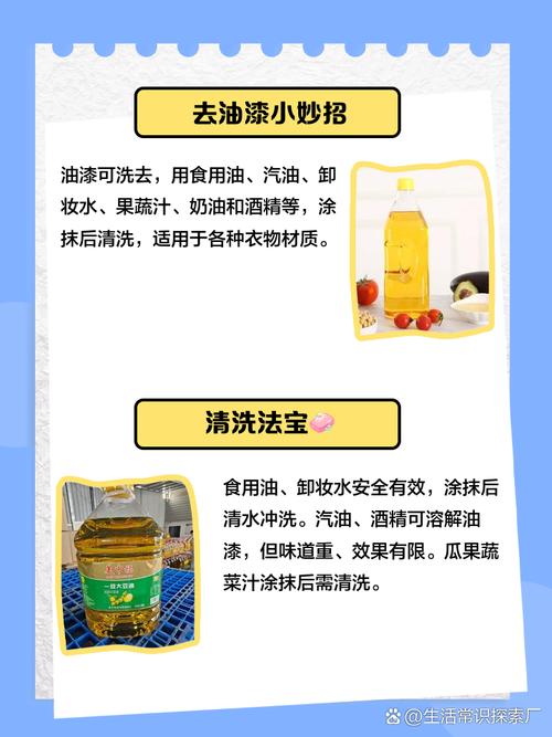 〖One〗、使用清凉油或猪油:首先,区分油漆的类型。如果是普通水溶性油漆,可以直接用水清洗。对于非水溶性油漆,可以涂抹驱蚊用的清凉油在油漆渍上,隔几分钟后,用棉花球沿着衣料纹理擦拭,然后用清水洗净。如果是尼龙布料,建议使用猪油擦洗,再用洗衣粉清洗。