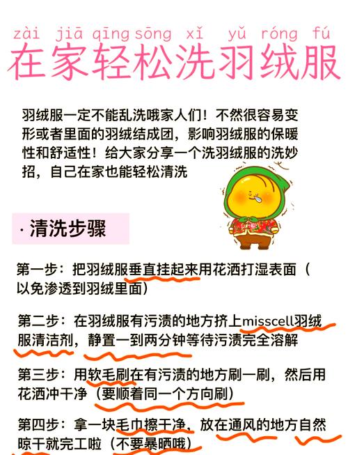 清洗羽绒服可以尝试这些实用小妙招:局部清洁妙招:如果羽绒服只是局部脏了,不建议整件清洗。可准备一块干净的毛巾,在温水中加入适量的中性洗涤剂,将毛巾浸湿拧干,轻轻擦拭污渍处,然后用干净的湿毛巾再擦一遍,吸干洗涤剂残留,最后自然晾干。