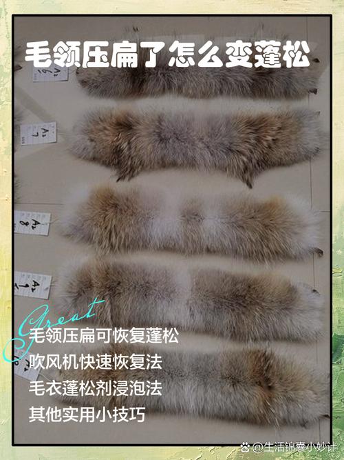 〖Four〗、毛领压扁了可以通过以下方法变蓬松:干洗并吹干:将毛领送到专业洗涤店进行干洗,之后使用吹风机顺着毛领的方向吹干,这样可以使毛领恢复蓬松状态。注意选取低温档,避免高温损伤毛质。竖着抖动:将毛领上下抖动,这样可以使毛领上的毛发重新变得顺滑和蓬松。