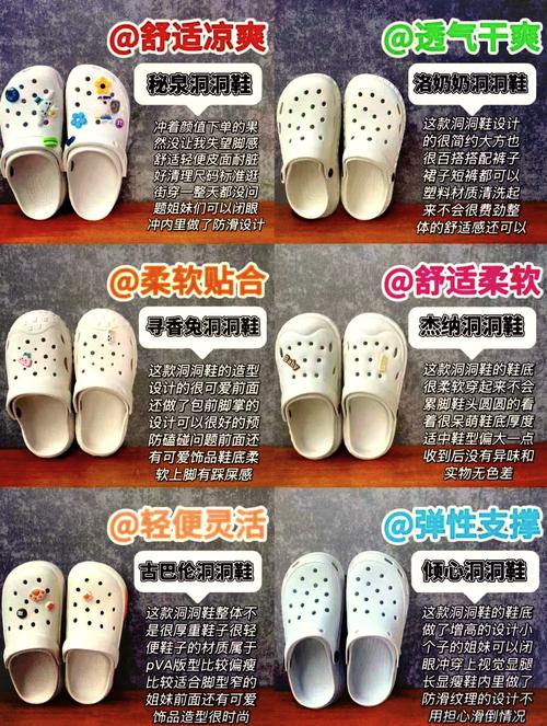 乙烯醋酸乙烯酯(EVA)或聚氨酯(Polyurethane):这些材料具有抗菌功能,可以减少脚部细菌的滋生,有助于抑制脚臭。总结:选取透气性好、吸湿性强的材质制成的洞洞鞋,以及具有抗菌功能的鞋底材料,可以有效帮助保持脚部的干爽,减少脚臭的产生。