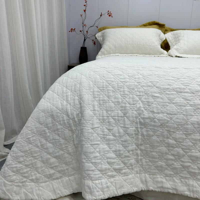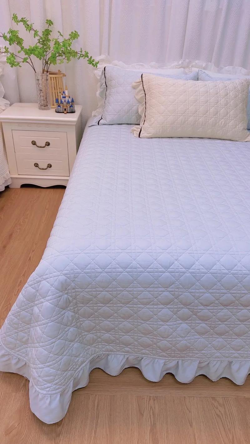 〖Three〗、一般是用于覆盖床面,既能遮挡床单脏污便于清洗,又可以成为一种装饰品,能够增加卧室的美观以及氛围。床盖是一种床上的纺织品,通常其面料都是采用阔幅手感柔软、保暖性好的织物,带有类似绗缝的花样或者图案的床布,其布料平整、花型多种多样,具有易洗快干、耐刮、坚牢耐磨等优点。
