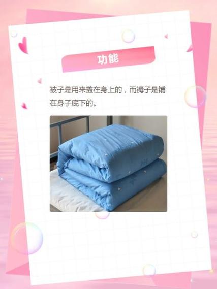 〖One〗、床盖和褥子的作用不同。床盖是用来盖在身上的,而褥子则是垫在床单下面的棉制品。床盖起到保暖作用,褥子则提供舒适的支撑。 被子是睡觉时覆盖在身上的保暖物品,而褥子则是铺在床单之下,用来垫在身下的。 褥子通常比被子要小,质地柔软,给人带来舒适的睡眠体验。